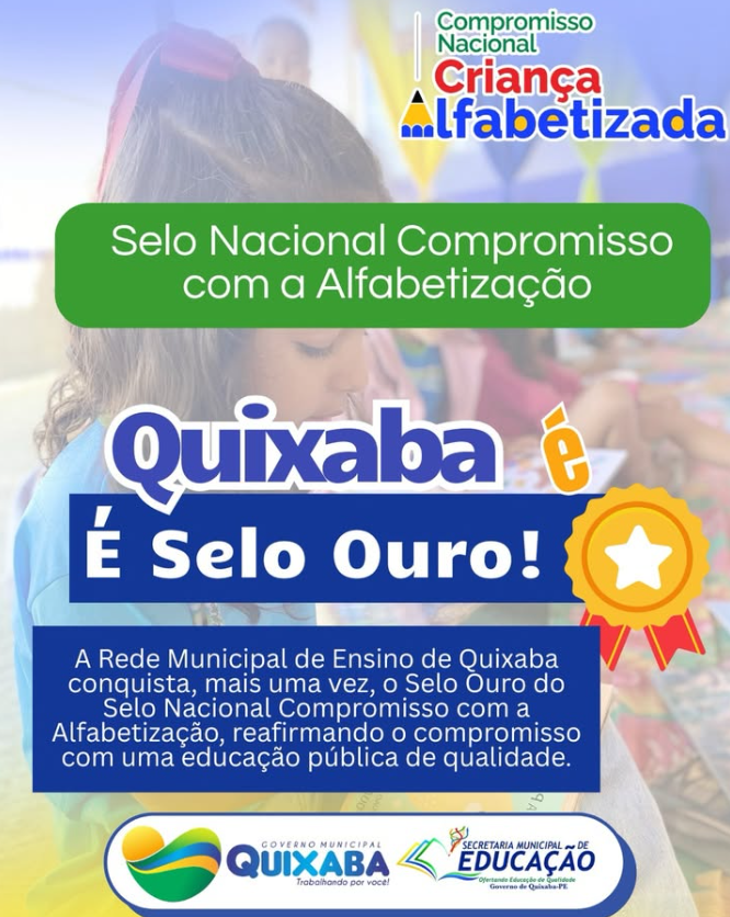 A educação de Quixaba segue sendo motivo de orgulho. A Rede Municipal de Ensino conquistou, mais uma vez, o Selo Ouro do Compromisso Nacional Criança Alfabetizada, reconhecimento concedido aos municípios que se destacam no fortalecimento das políticas públicas voltadas à alfabetização na idade certa. A premiação reafirma o compromisso do município com uma educação pública