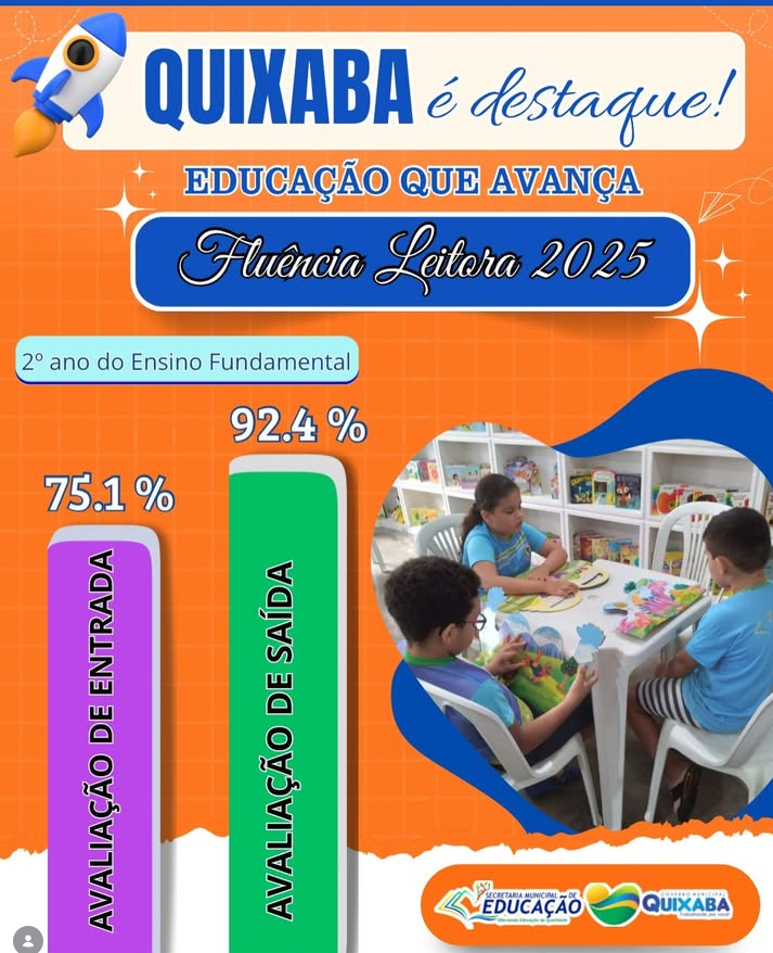 O Governo Municipal de Quixaba, por meio da Secretaria Municipal de Educação, comemora os excelentes resultados alcançados pelos estudantes do 2º ano do Ensino Fundamental da Rede Municipal, referentes ao ano letivo de 2025. Em dezembro de 2025, os alunos participaram da Avaliação de Saída de Fluência Leitora e obtiveram um expressivo índice de 92,4%