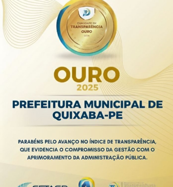 A Prefeitura de Quixaba alcançou, de forma inédita, a classificação Ouro na avaliação dos Portais da Transparência realizada pela ATRICON (Associação dos Membros de Tribunais de Contas do Brasil). Este resultado reflete o compromisso da gestão municipal com a transparência, a responsabilidade e o respeito ao cidadão.